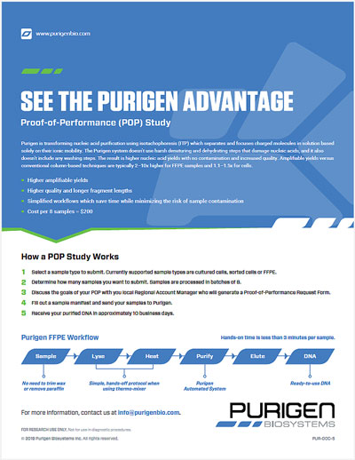 The Ionic Purification System from Purigen Biosystems uses isotachophoresis (ITP) to extract, purify, and concentrate genomic DNA from cells and and FFPE. Since nucleic acids remain in their native form, not denatured or dehydrated, the Ionic system is ideal for challenging samples with limited starting material or low-quality material.